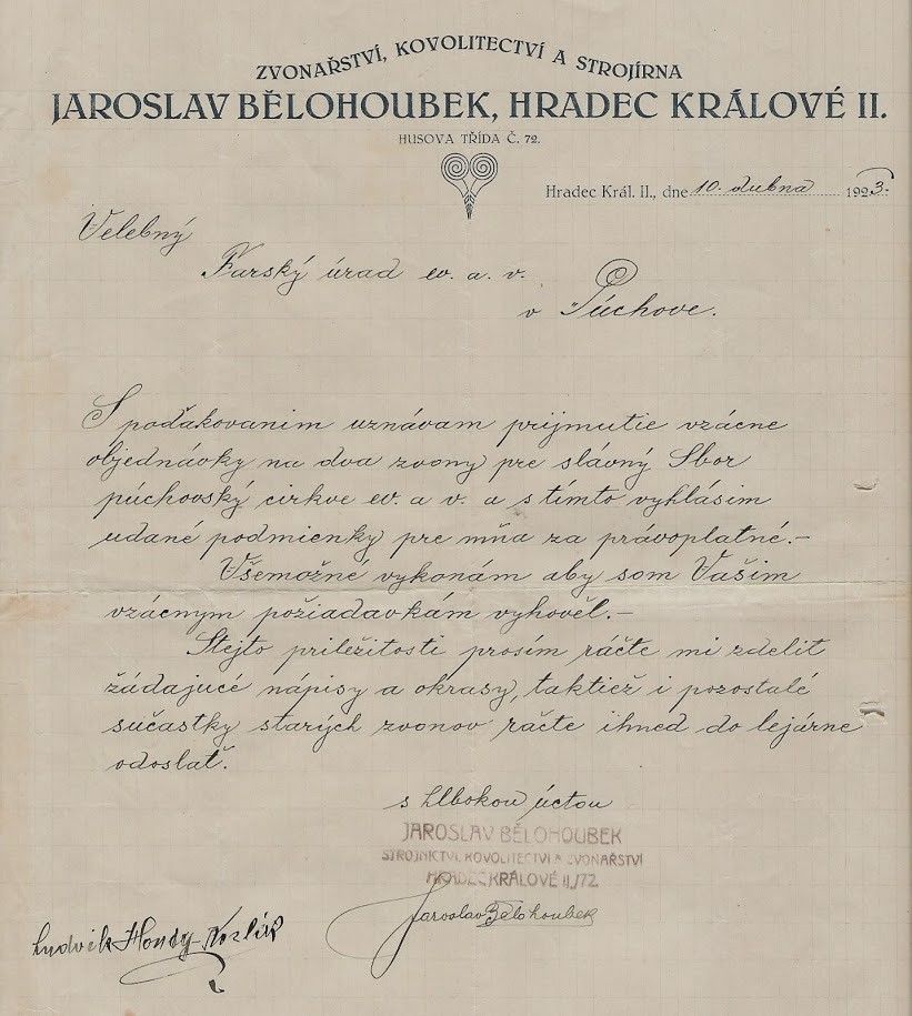 V Hradci Králové v dielni Jaroslava Bělohoubeka boli odliate: MALÝ a VEĽKÝ zvon. Objednávka na tieto zvony je podpísaná obchodným zástupcom firmy 25. marca 1923 v Púchove s termínom zavesenia zvonov na vežu do 26.5.2023. 10. apríla píše Jaroslav Bělohoubek na púchovskú faru potvrdenie a požaduje uviesť texty, ktoré majú byť na zvonoch uvedené. Už 15.5.1923 oznamuje Bělohoubek, že zvony sú hotové, a sú na ceste do Púchova. Žiada farára Roya, aby ho telegraficky informoval o doručení zvonov na púchovskú stanicu za účelom vyslania montéra. Tieto zvony sú vo veži chrámu dodnes – popis viď nižie.