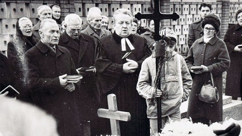 Pamätníci si ju pamätajú ako zbožnú ženu, ktorá sa starala o výzdobu kostola. Spoznávate ľudí na fotografií, ktorí sa v tejto neprajnej dobe nebáli postaviť za farára a spievať nábožné piesne? Naviac, keď tento okamih zvečnil fotoaparátom Miro Vavrík. Pochovával farár Ján Zaťko, kríž drží jeho syn Peter. Za ním stoja zľava: Škripcová, Mitana, Bošková, Kožík, Kováčik, Kosiba, Kolárová, Bošková, Molitorová, Marcina, Vavríková, Gurínová.