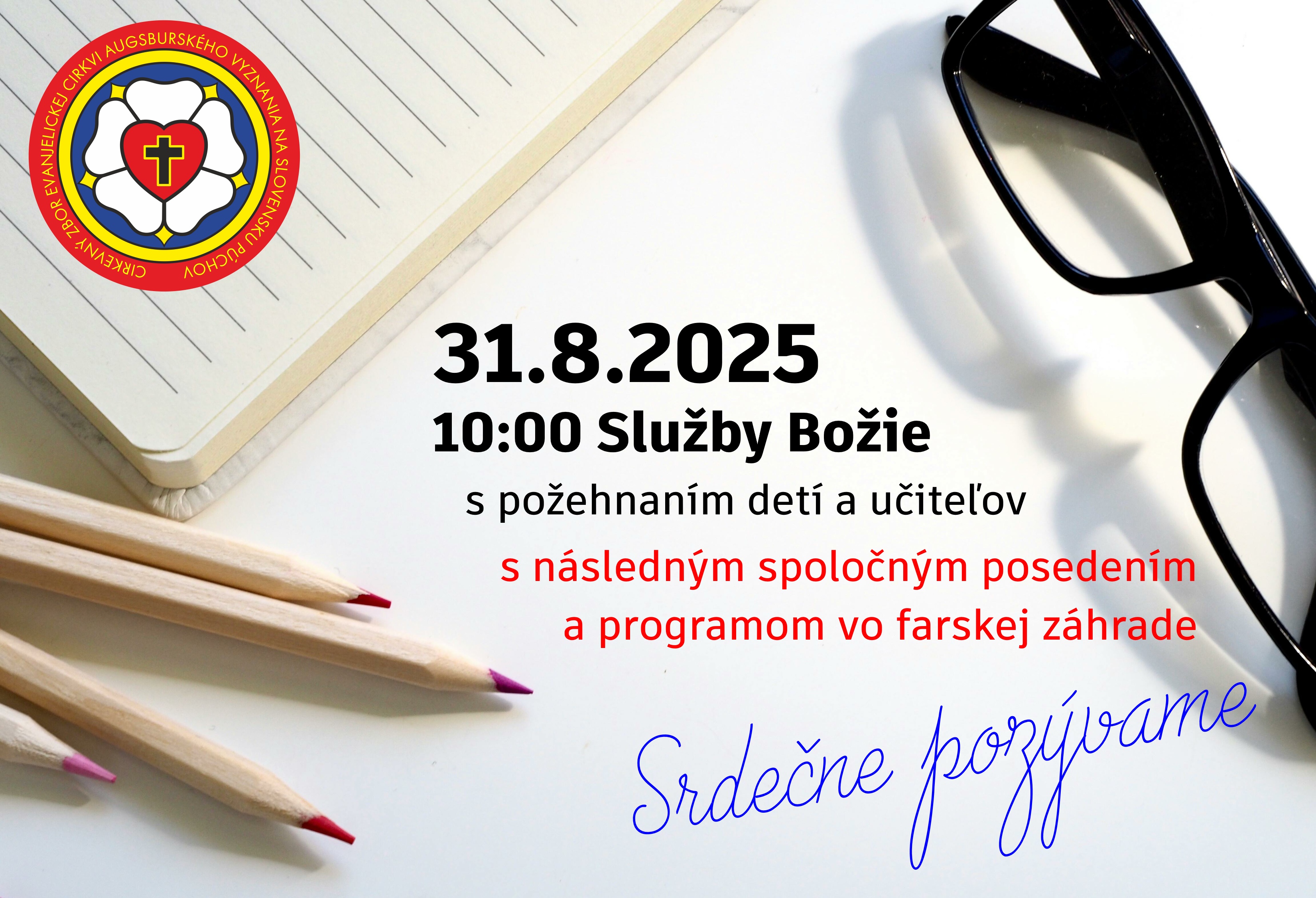Začnite nový školský rok 2025/2026 s požehnaním! Pozývame vás na služby Božie spojené s požehnaním detí, žiakov, študentov, učiteľov. Budú sa konať v nedeľu 31.8.2025 o 10:00 s následným spoločným posedeníma a programom vo farskej záhrade. Srdečene vás pozývame.